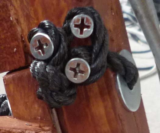 | ハンドルの回転は前輪の棒に4本のヒモで構成されます。 ヒモは木ねじに巻き付けて木ねじの間に結び目を引っかける事で固定します。付け外しがわりと簡単にできます。 ヒモに加えて、木のストッパーを付けて加重をヒモだけで支えないようにしてます。 ![]() ![]() |