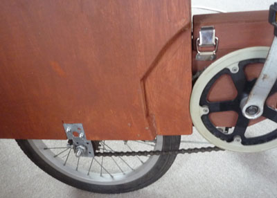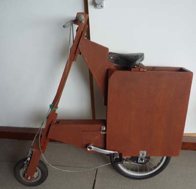 | ◆折畳み ペダルと前輪との間の木箱を外し、前輪ハンドル部の4つのヒモを外す事で折畳めます。 ![]() |